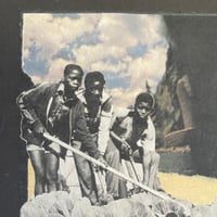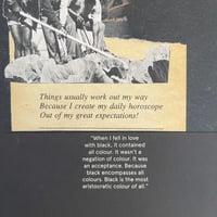 Descriptive text: textured black background with white edges, Black boys at center tilling leafy greens against sky blue background with clouds. Text at top of the piece reads "BLACK" with the number 163 in the right hand corner. Text below the boys reads "Things usually work out my way Because I create my daily horoscope Out of my great expectations" bottom text reads "When I fell in love with black, it contained all colour. It was an acceptance. Because black encompasses all colours. Black is the most aristocratic colour of all."